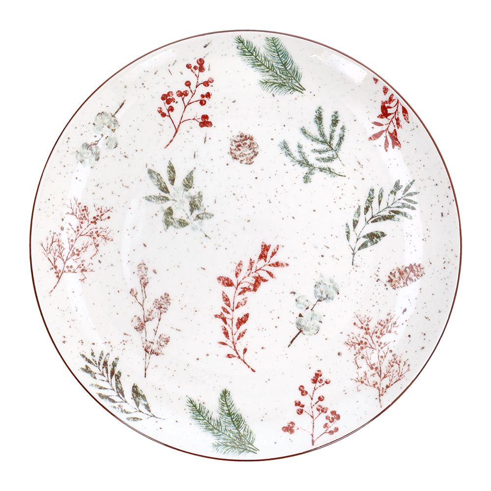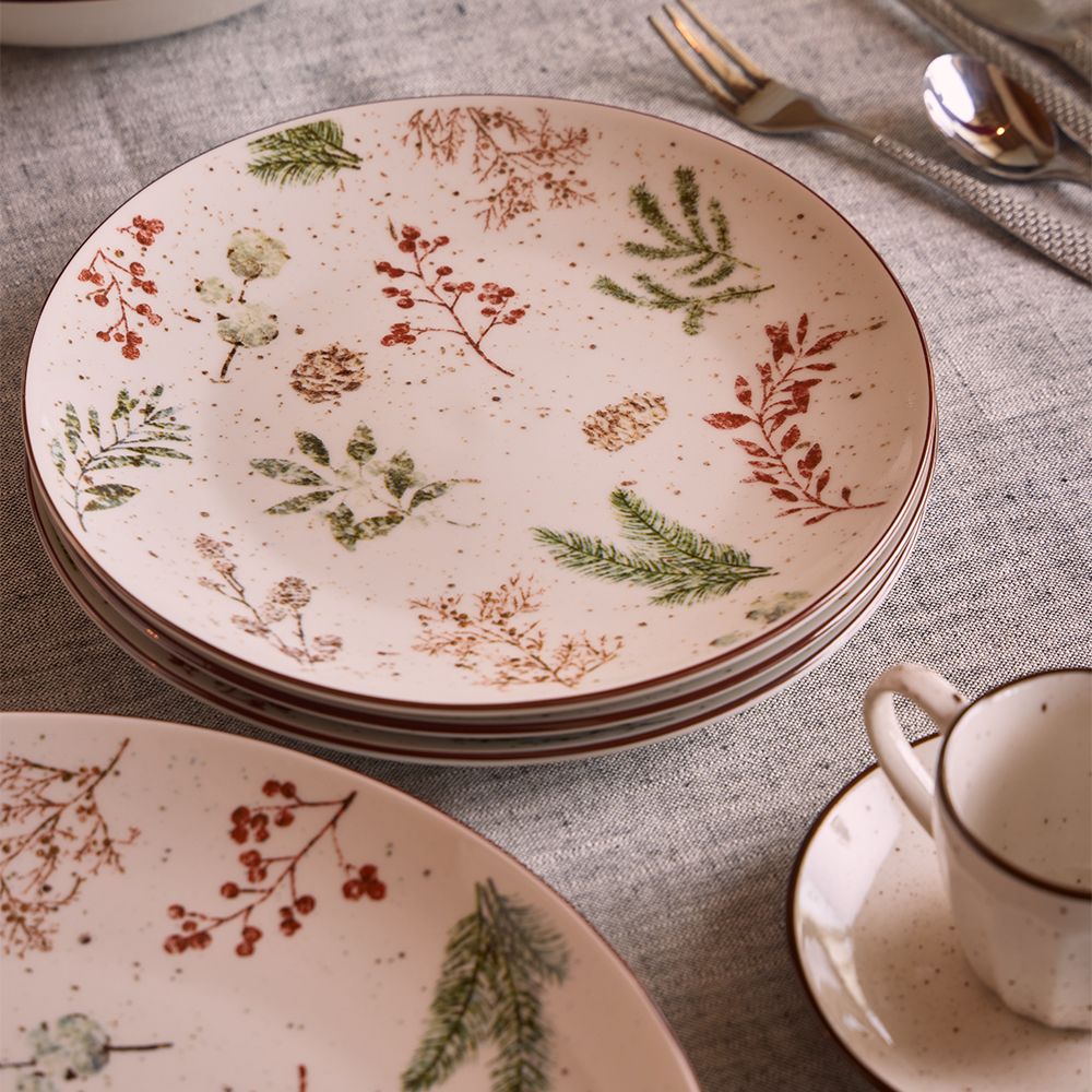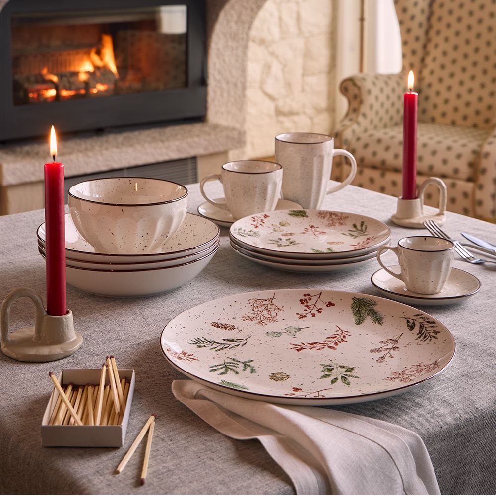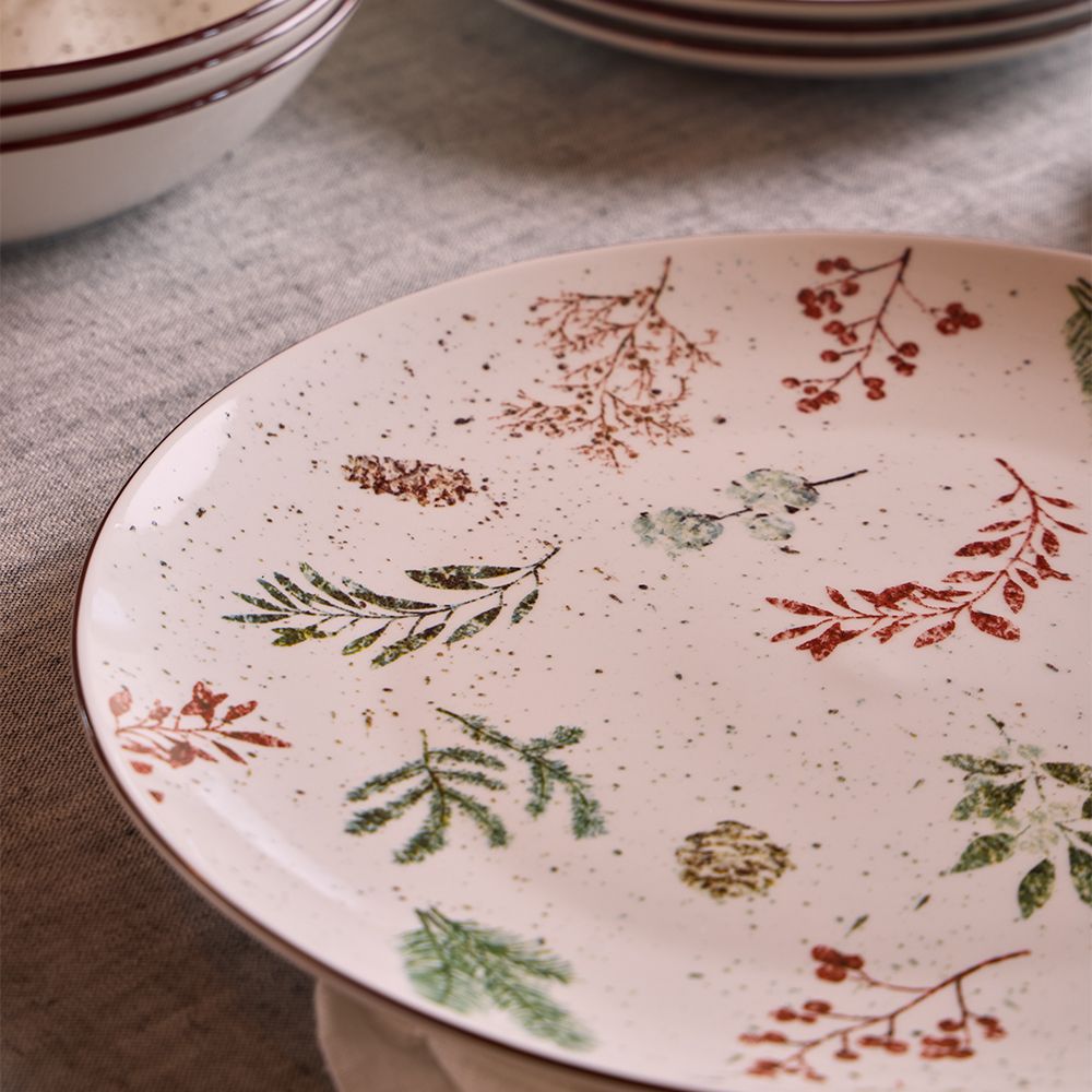 Los cálidos tonos rojizos y verdes se combinan con una base marfil punteado, evocando tranquilos paisajes invernales y un ambiente acogedor.