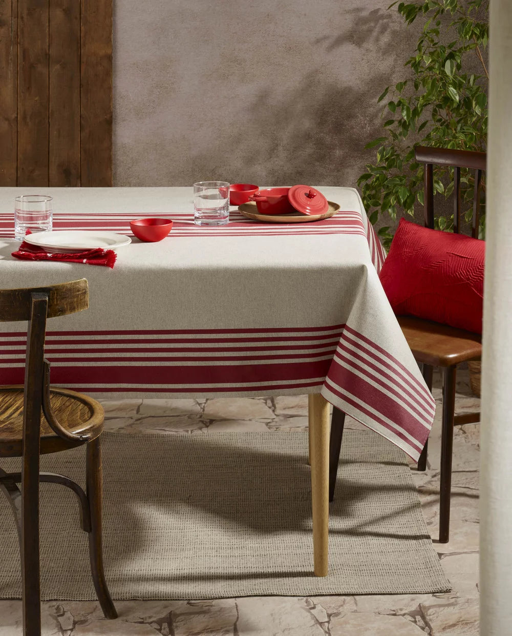 Mantel de tela plastificado. Se limpia con la bayeta. Se puede meter en la lavadora(se vende al corte en varias medidas). Existe en 2 colores.